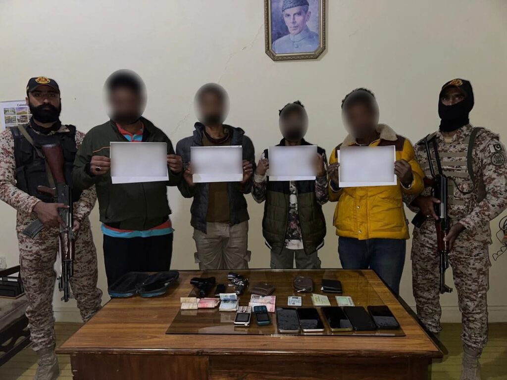 کراچی : ( رپورٹ: محمد حسین سومرو) پاکستان رینجرز (سندھ) نے خفیہ معلومات کی بنیاد پر کارروائی کرتے ہوئے کراچی کے علائقے ایف سی ایریا لیاقت آباد سے ڈکیتی, اسٹریٹ کرائم اور منشیات فروشی کی متعدد وارداتوں میں ملوث 4 ملزمان انس عرف شانی ولد آصف، سید ظاہر حسین عرف ضیاء ولد سید زوار حسین، محمد جاوید عرف چپٹا ولد بشیر احمد اور دانیال عرف کلر والا ولد صابر حسین کو گرفتار کر لیا۔