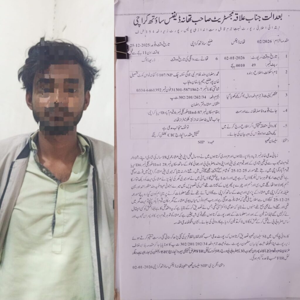 تفصیلات کے مطابق، ڈیفنس پولیس کے تھانے کی حدود میں واقع قیوم آباد کے ایک رہائشی یونٹ میں عشنا اور اس کے شوہر قیوم محبوب رہائش پذیر تھے۔ ابتدائی معلومات سے معلوم ہوتا ہے کہ گھریلو اختلافات نے 25 دسمبر 2025 کو ایک المناک موڑ اختیار کیا، جب معمولی سے جھگڑے نے ایک سنگین تصادم کی شکل اختیار کر لی۔ پولیس کے مطابق، قیوم نے غصے میں اپنی اہلیہ عشنا کو قتل کر دیا۔