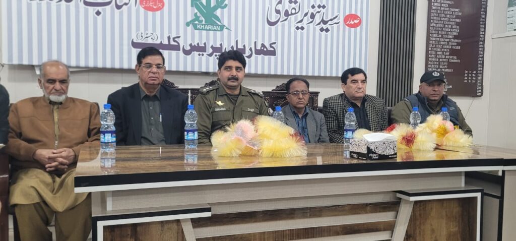 تقریب کا آغاز قاری رزق انصاری کی تلاوتِ کلامِ پاک سے ہوا جبکہ ہدیۂ نعت سلیم بٹ نے پیش کر کے سماں باندھ دیا۔تقریب سے خطاب کرتے ہوئے ڈی ایس پی شاہد گجر نے کہا کہ کھاریاں پریس کلب کے صحافی پیشہ ورانہ ذمہ داریوں کے ساتھ ساتھ سماجی خدمات بھی نہایت احسن انداز میں سرانجام دے رہے ہیں، جو بلاشبہ قابلِ تحسین عمل ہے۔ انہوں نے کہا کہ کھاریاں پریس کلب آ کر دلی مسرت محسوس ہوئی اور یہاں کا ماحول نہایت خوشگوار، مثبت اور صحافتی اقدار کا عکاس ہے۔ڈی ایس پی شاہد گجر نے مزید کہا کہ صحافی معاشرے کی آنکھ اور آواز ہوتے ہیں، جو حقائق کو اجاگر کرنے اور عوامی مسائل کو سامنے لانے میں کلیدی کردار ادا کرتے ہیں۔ پولیس اور میڈیا کا باہمی تعاون معاشرے میں امن و امان کے قیام کے لیے ناگزیر ہے۔ انہوں نے اس عزم کا اظہار کیا کہ کھاریاں پولیس صحافی برادری کے ساتھ ہر ممکن تعاون جاری رکھے گی اور مثبت، ذمہ دارانہ اور تعمیری صحافت کو ہر سطح پر سراہا جائے گا۔اس موقع پر صدر کھاریاں پریس کلب سید تنویر نے خطاب کرتے ہوئے کہا کہ کھاریاں پریس کلب کے تمام ممبران ورکنگ جرنلسٹس ہیں اور بلیک میلنگ جیسی منفی صحافت سے ہمارا کوئی تعلق نہیں۔ ہم نیک نیتی، دیانت داری اور پیشہ ورانہ ذمہ داری کے ساتھ اپنے فرائض سرانجام دے رہے ہیں۔ انہوں نے کہا کہ صحافت ایک مقدس پیشہ ہے، جس کا مقصد عوامی مسائل کی نشاندہی، حقائق کی ترجمانی اور معاشرتی اصلاح ہے۔تقریب میں سرپرستِ اعلیٰ ملک شبیر حسین اعوان، سینئر جرنلسٹ اعجاز مرزا، زمان احسن، سلیم بٹ، ملک علی ظفر، عزیز گوندل، جبار ساگر، گل بخشالوی، رضوان لیاقت قادری اور شاہد بیگ سمیت دیگر معزز صحافیوں نے شرکت کی جبکہ