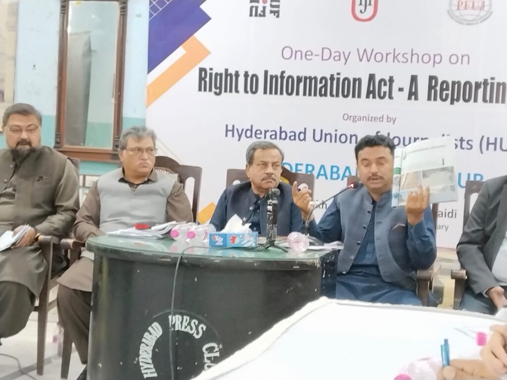 حیدرآباد ( رپوٹ عمران مشتاق ) حیدرآباد یونین آف جرنلسٹس کے تحت صحافیوں کی آگاہی کے لئیے معلومات تک رسائی کے قانون رائٹ ٹو انفارمیشن کے حوالے سے ایک روزہ ورکشاپ کا پریس کلب کے آڈیٹوریم ہال میں انعقاد کیا گیا ورکشاپ کے مہمان خصوصی کاشف خان شورو مئیر حیدرآباد سندھ انفارمیشن کمشنر سلیم احمد خان نور احمد دایو ایگزیکٹیو ڈائریکٹر ذوالفقار شیخ صدر پریس کلب جنید خانزادہ ایچ یو جے کے صدر حامد میاں شیخ اسپیکرز محمد حسین خان بوٹا امتیاز کوآرڈینیٹر علی حمزہ زیدی سمیت صحافیوں کیمرہ مینز اور فوٹو گرافرز نے بڑی تعداد میں شرکت کی ورکشاپ کے مہمان خصوصی مئیر حیدرآباد کاشف خان شورو نے خطاب کرتے ہوئے کہاکہ سندھ کے تمام سرکاری محکموں کے بارے میں معلومات حاصل کرنا عوام کا حق ہے ان کے ووٹوں سے کامیاب ہوکر آئے ہیں جوابدہ بھی ہیں پیپلز پارٹی نے حیدرآباد میں بڑے بڑے پروجیکٹس پر کام کیا ہے آٹا بھان کی 15کلو میٹر شاہراہ جو ہالہ ناکہ تک جارہی ہے پر بڑی تیزی سے کام جاری ہے لطیف آباد میں ایک اور فلٹر پلانٹ قائم کیا جارہا جبکہ قاسم آباد اور ہٹری کے مقام پر ایک ایک فلٹر پلانٹ بنانے کی حکومت نے منظوری دیدی ہے وہ بہت جلد مئیر سیکٹریٹ میں صحافیوں کو ترقیاتی کاموں کے حوالے سے ثبوتوں کے ساتھ بریفننگ دیں گے سندھ انفارمیشن کمشنر نور احمد دایو نے کہاکہ ایک کرپٹ افسر حکومت کے پورے نظام کو ناکارہ بنانے کے لئیے کافی ہے محکموں میں موجود کرپٹ افسران نے پورے معاشرہ کا بیڑہ غرق نظام کو کھوکھلا کرکے رکھ دیا ہے محکموں میں موجود کرپٹ افسران کو درست کرنے کی اشد ضرورت ہےمیڈیا رائٹ ٹو انفارمیشن قانون کے حوالے سے عوام کو آگاہی فراہم کرے انفارمیشن کمشنر سلیم احمد خان نے کہاکہ قانون کے تحت ہر شہری عوام کی دلچسپی پر مبنی معلومات سرکاری اداروں سے حاصل کرسکتا ہے سیکشن 6 تمام اداروں کو معلومات کی فراہمی کا پابند بناتا ہے ایگزیکٹیو ڈائریکٹر ذوالفقار شیخ نے کہاکہ معاشرہ میں سدھار پیدا کرنے کے لئیے ہمیں مل جل کر کام کرنے کی ضرورت ہے ہر انسان اپنے ضمیر کے مطابق کام کرے یاد رکھیں آخری کامیابی ہمیشہ اچھائ کی ہی ہوتی ہے انہوں نے کہاکہ سندھ انفارمیشن کا پہلا ڈویژنل آفس حیدرآباد میں قائم کیا جائیگا ورکشاپ سے سنئیر صحافی و صدر پریس کلب جنید خانزادہ اسپیکرز محمدحسین خان بوٹا امتیاز ایچ یو جے کے صدر حامد میاں شیخ اور جنرل سیکریٹری علی حمزہ زیدی نے بھی خطاب کیا ورکشاپ کے اختتام پر مہمان خصوصی مئیر بلدیہ کاشف خان شورو نور احمد دایو سلیم احمد خان ذوالفقار شیخ اور جنید خانزادہ نے ورکشاپ میں شریک صحافیوں الطاف کوٹی بشیر بھٹی ہارون آرائیں اخلاق احمد عبد الخالق شیراز بھٹی وقاص آرائیں محمد حسن عباس شاہ یاسین حمید عمران مشتاق ارشد انصاری ارشد جبار شیزا صباء عمیر راجپوت اور دیگر میں سرٹیفکیٹ تقسیم کئیے