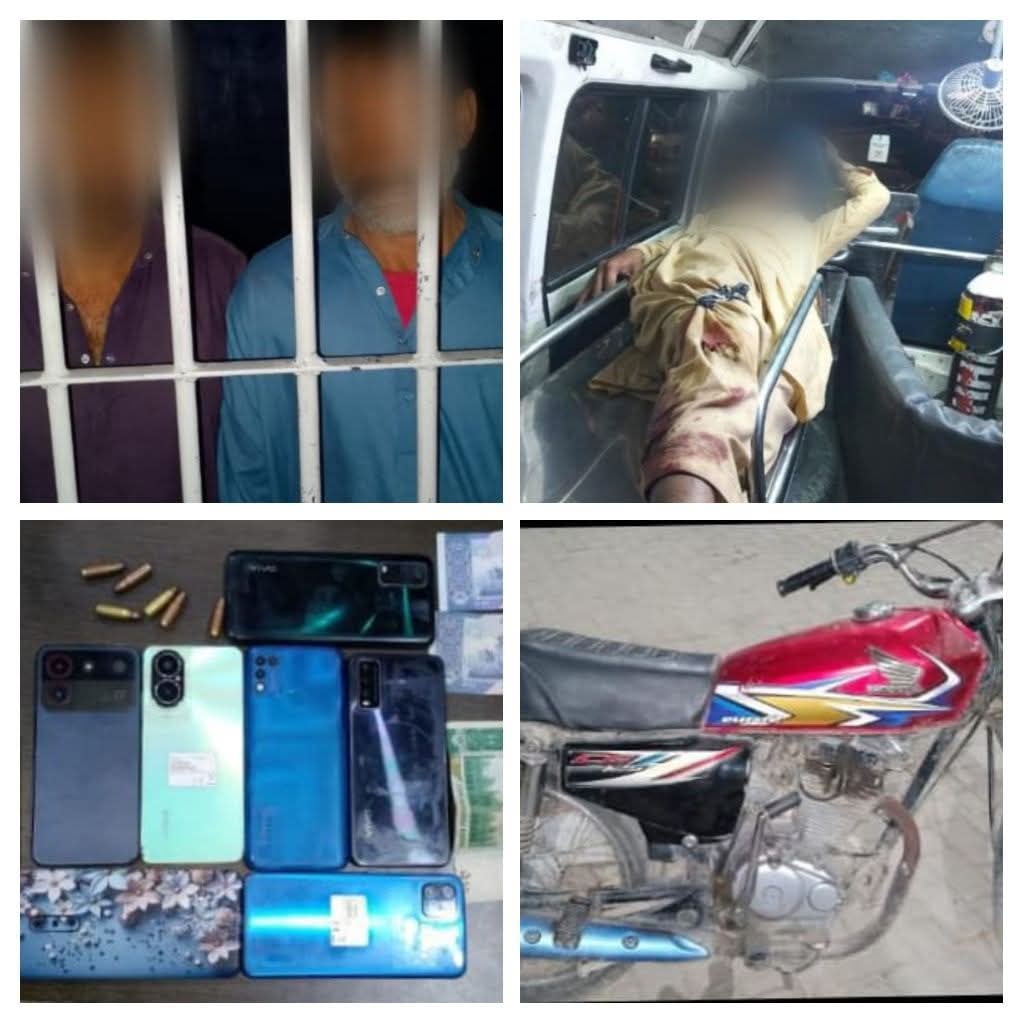 زخمی ملزم کی شناخت عامر کے نام سے ہوئی، جبکہ گرفتار ملزمان علی حسن اور نبی بخش ہیں۔ ملزمان کے قبضے سے ایک پستول بمعہ ایمونیشن، سات چھینے گئے موبائل فون، نقد رقم اور ایک 125 سی سی موٹر سائیکل برآمد ہوئی۔