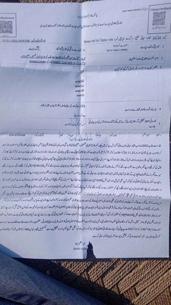 سرگودھا(بیوررپورٹ)سرگودھا کے تھانہ میانی کے علاقہ نیازی کالونی میں ظلم کی انتہا غیرت کے نام پر شادی شدہ خاتون کو موت گھاٹ اتاردیا مقدمہ درج ملزم گرفتار نہ ہوسکے۔تفصیلات کے مطابق 23سالہ مقتولہ زوحہ کوثر راجپوت نے مئی 2025میں حافظ آباد کے رہائشی عمیر نامی لڑکے سےپسند کی شادی کرلی تھی اور اس کے گھر والوں نے اس پر اغواکا مقدمہ درج کرواکر گھر سے رخصتی کے بہانہ طلاق لے لی ۔وہاڑی کے وہائشی عامرسہیل نے تھانہ میانی میں مقدمہ درج کرواتے ہوئے بتایا کہ اس کی شادی سرگودھا کے تھانہ میانی کے علاقہ نیاز کالونی میں ایک ماہ اٹھارہ دن قبل ہوئی اور وہ ڈیوٹی پر جاتے ہوئے اپنی اہلیہ مقتولہ زوحہ کوثر کے سسرال گھر چھوڑ گیا۔جس پر اسکی اہلیہ نے اپنے بھائیوں ارسلان عمران شہزاد اور والد کا رویہ دیکھتے ہوئے کال کی کہ میری جان کو خطرہ مجھے یہاں سے لے جائیں جب وہ وہاں لینے پہنچا تو اس قبل انہوں نے اسے قتل کردیا۔اور طبی موت کا جواز بناکر تدفین بھی کردیں۔جس پر پولیس تھانہ میانی نے ملزمان کے خلاف مقدمہ درج کرلیا اور قبر کشائی کرکے نمونہ جات لیبارٹری بھجوادیئے۔مدعی عامر سہیل کے مطابق تاحال کوئی ملزم گرفتار نہ ہوسکا۔اور اسے بھی ملزمان سنگین نتائج کی دھمکیاں گارہے ہیں۔۔مدعی اس بے گناہ قتل پر ڈی پی او سرگودھا محمد صہیب اشرف اور وزیراعلی’ پنجاب سے نوٹس لینے کی اپیل کی ہے