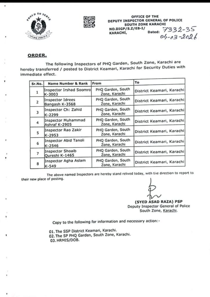 ڈی آئی جی ساوتھ زون کراچی کا انسپکٹرز کے تبادلوں اور پوسٹنگ کا حکم نامہ جاری