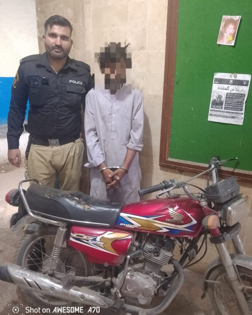 کراچی:( رپورٹ: محمد حسین سومرو) تھانہ عزیز آباد پولیس کی موبائل نے دورانِ گشت اللہ والی چورنگی، نزد مدنی مسجد، ایک مشتبہ شخص کو موٹر سائیکل نمبر KNN-5360 پر سوار دیکھا۔ اسے روک کر تفتیش کی گئی تو وہ موٹر سائیکل کے کاغذات پیش نہ کر سکا۔ موٹر سائیکل کو بذریعہ CPLC چیک کیا گیا۔