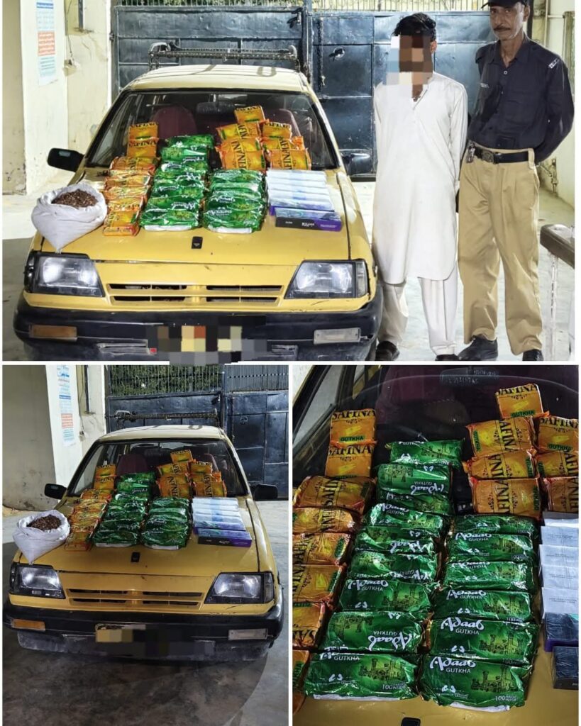 پولیس نے کارروائی کے دوران ملزم کے قبضے سے 5 کلو نان کسٹم پیڈ چھالیہ، 15 پیکٹ انڈین سفینہ گٹکا، 15 پیکٹ انڈین آداب گٹکا، 7 پیکٹ نان کسٹم سگریٹ، موبائل فون، نقد رقم اور پیلی ٹیکسی نمبر PH-3159 برآمد کر لی۔