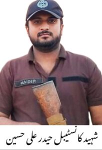 شہید کانسٹیبل حیدر علی حسین نے بغیر کسی خوف کے جان کی پرواہ کیے بغیر کئی افراد کو محفوظ مقام تک پہنچایا،ریسکیو کے دوران اچانک پانی کے بہاؤ میں شدت آ گئی جس کے دوران شہریوں کی جان بچاتے بچاتے خود اپنی جان کی بازی ہار گئے