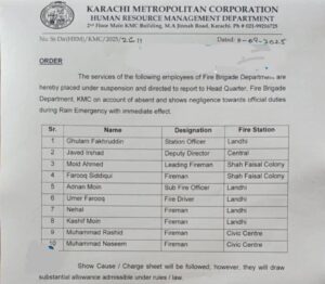 شاہ فیصل کالونی کے لیڈنگ فائر مین معید احمد معطل، کراچی فائر چیف محمد ہمایوں