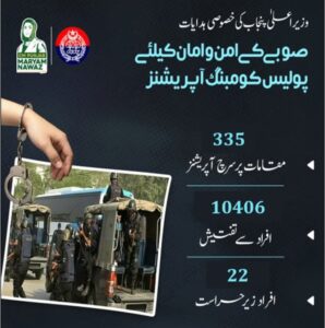 منشیات فروشی کیخلاف کریک ڈاؤن میں 37 افراد گرفتار کر کے مقدمات درج، بھاری مقدار میں منشیات برآمد۔ صوبے میں امن و امان کے قیام کیلئے 335 سرچ آپریشنز میں 10406 افراد سے پوچھ گچھ، 22 مشتبہ افراد گرفتار۔ بجلی چوری سے قومی خزانے کو نقصان پہنچانے والے 46 ملزمان گرفتار، 123 مقدمات درج۔ پتنگ بازی جیسے قاتل کھیل کی روک تھام کیلئے کارروائیوں میں 04 ملزمان گرفتار، مقدمات درج. ٹریفک قوانین پر عملدرآمد کے حوالے سے جاری مہم کے نتیجے میں 28909 ڈرائیونگ لائسنسز جاری کئے گئے، ٹریفک قوانین کی خلاف ورزیوں پر 42404 ٹریفک چالان کر کے 22 ملین روپے کا جرمانہ کیا گیا۔ پولیس خدمت مراکز کی ایک چھت تلے دستیاب 21 سہولیات سے 13454 شہری مستفید ہوئے۔